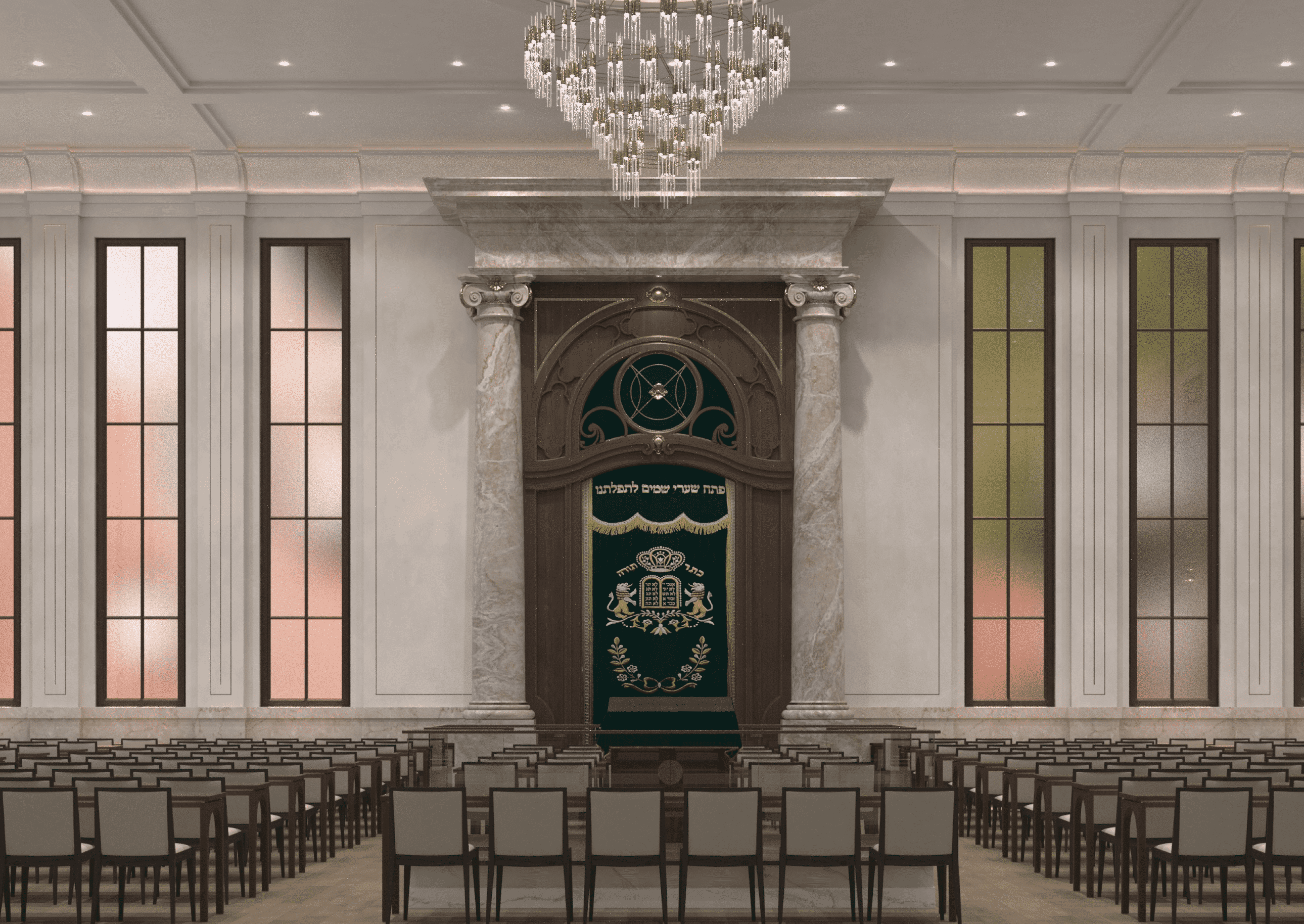 Modern synagogue building with tall arched windows, light-colored facade, and a tree on the left side.