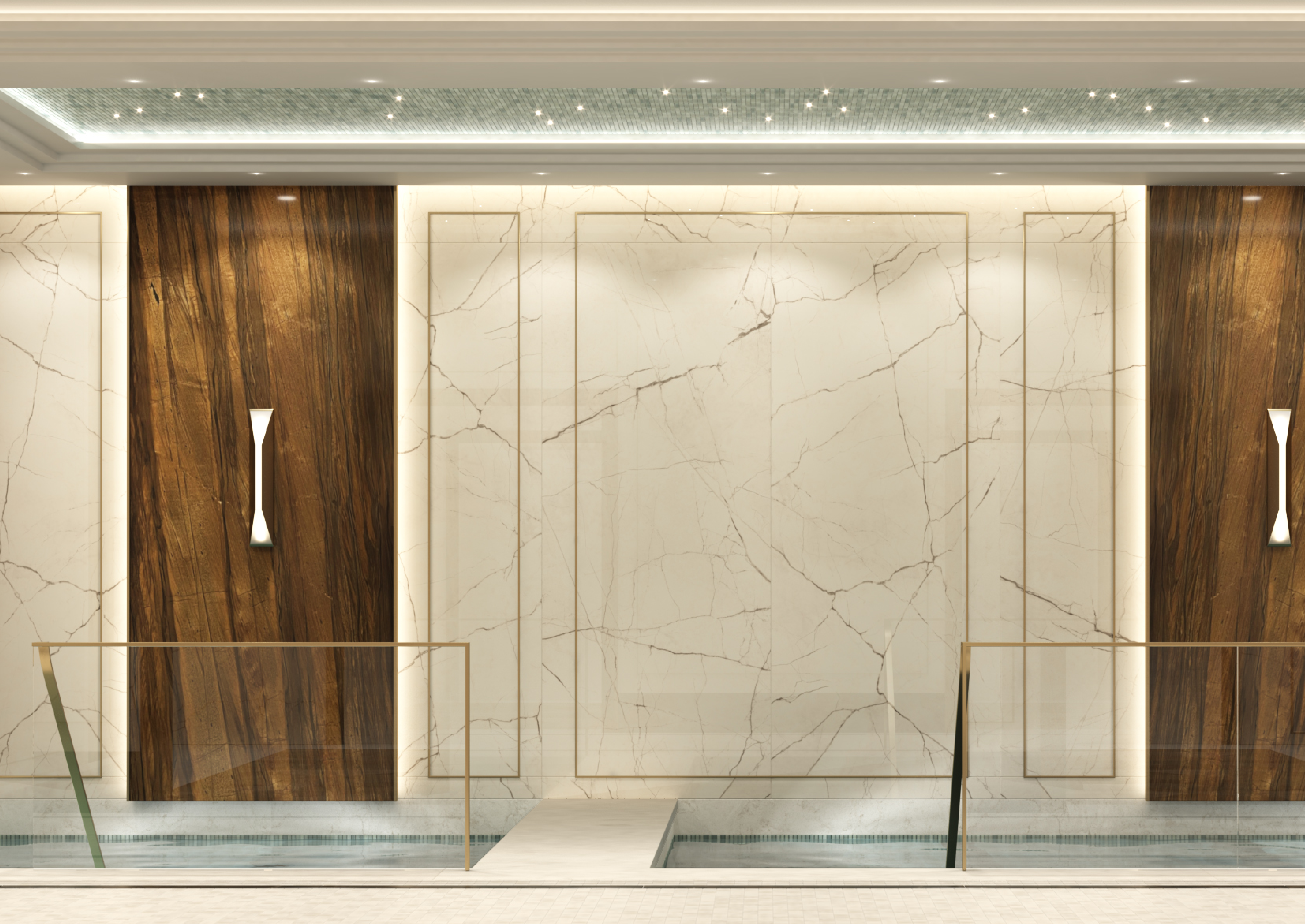 Elegant interior wall with large marble panels flanked by dark wood vertical panels, accented with modern vertical sconces and glass railings.