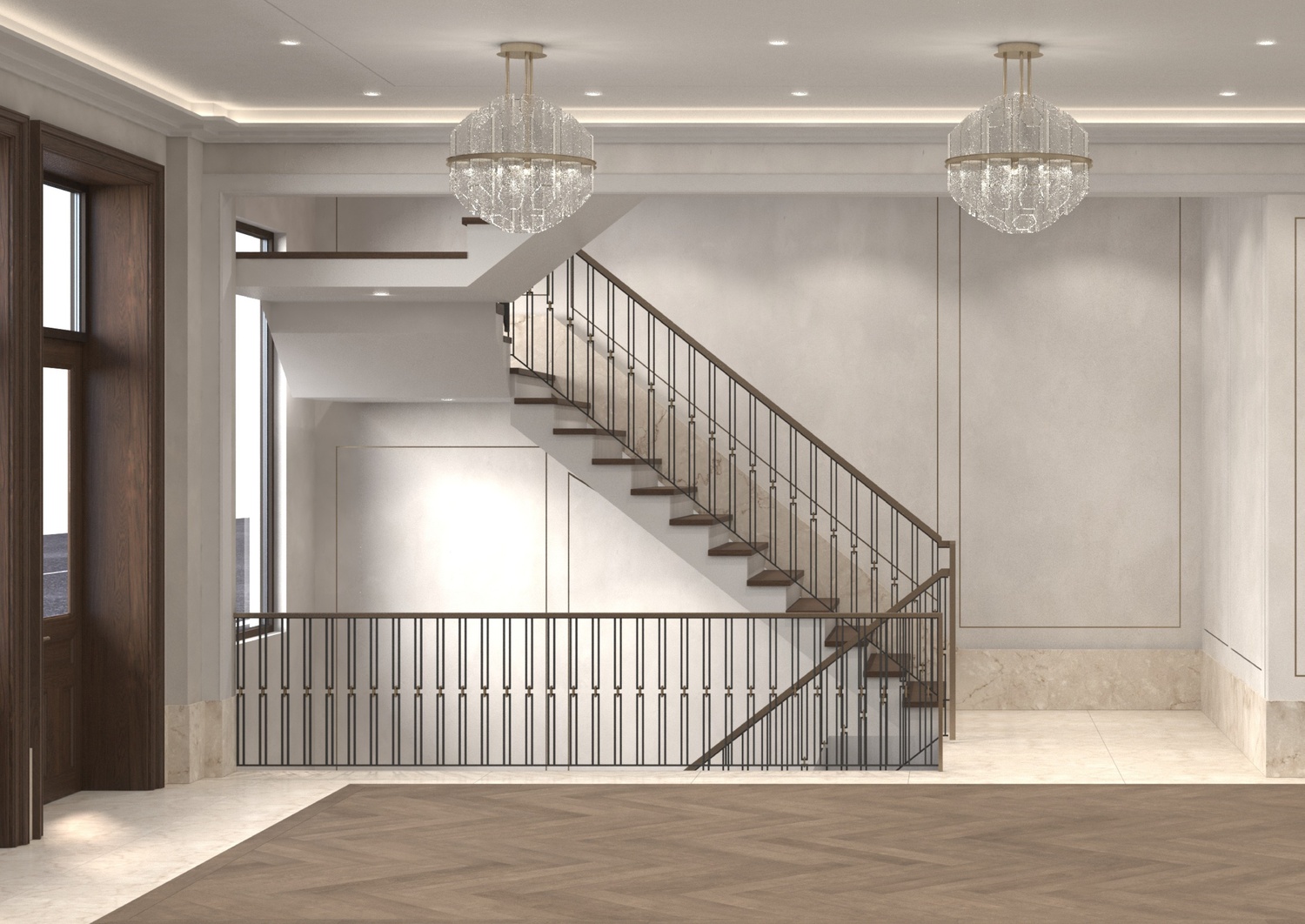 Modern lobby interior with marble walls, wooden panels, recessed ceiling lights, and glass railings.