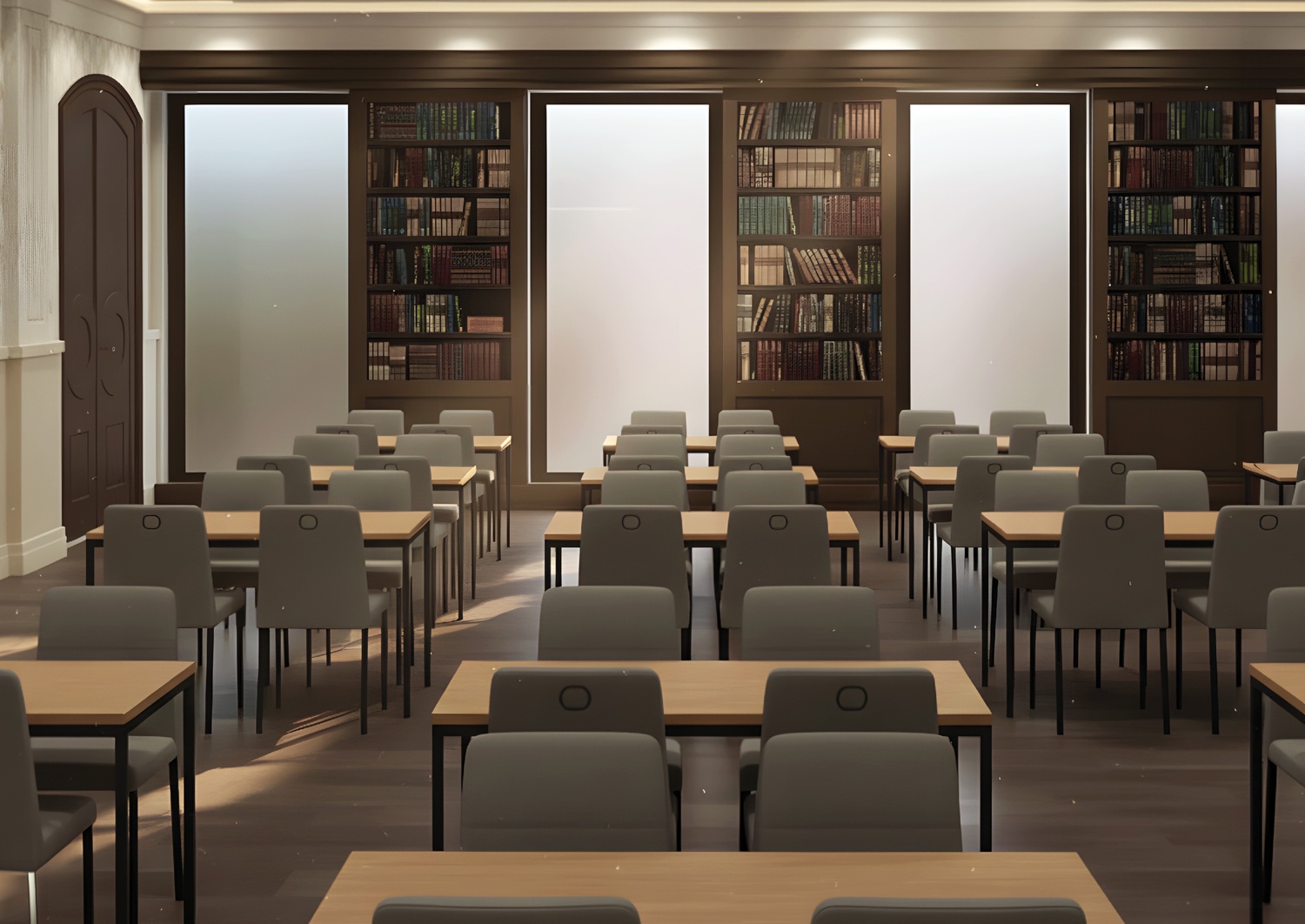 Spacious library or lecture hall with rows of tables and chairs, large bookshelves, and a decorative chandelier.